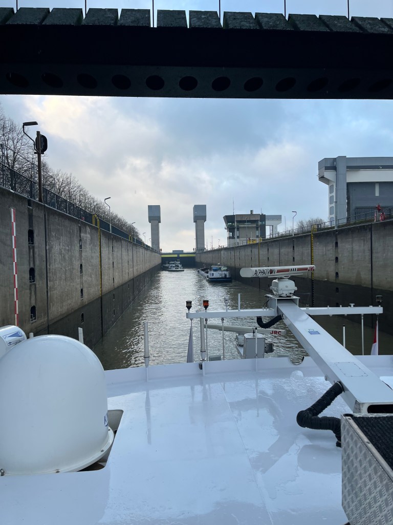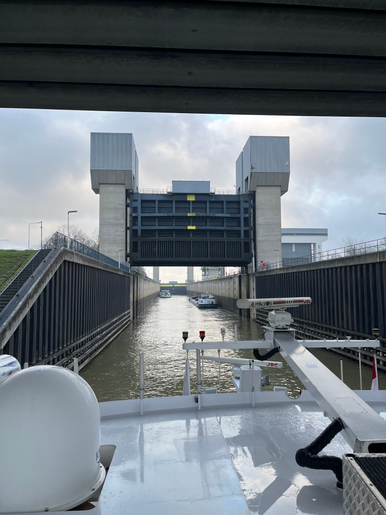 At the shore where our ship was docked there were these statues placed high on the stone wall. They were rather disconcerting at first glance because they’re just good enough that you might think they were real people. Across from the Mosel from the dock they shored the dredging ships for repairs and probably storage. It looks like they would winch them up the rails, and then release them to slide back into the water when needed.
