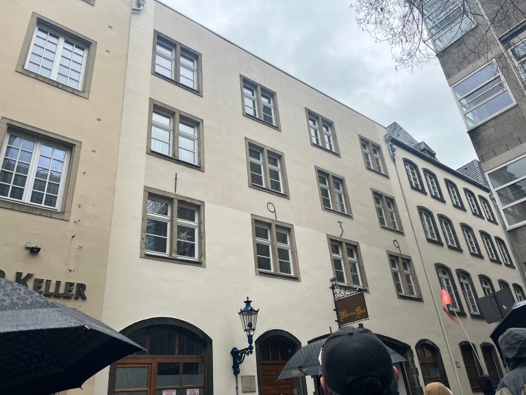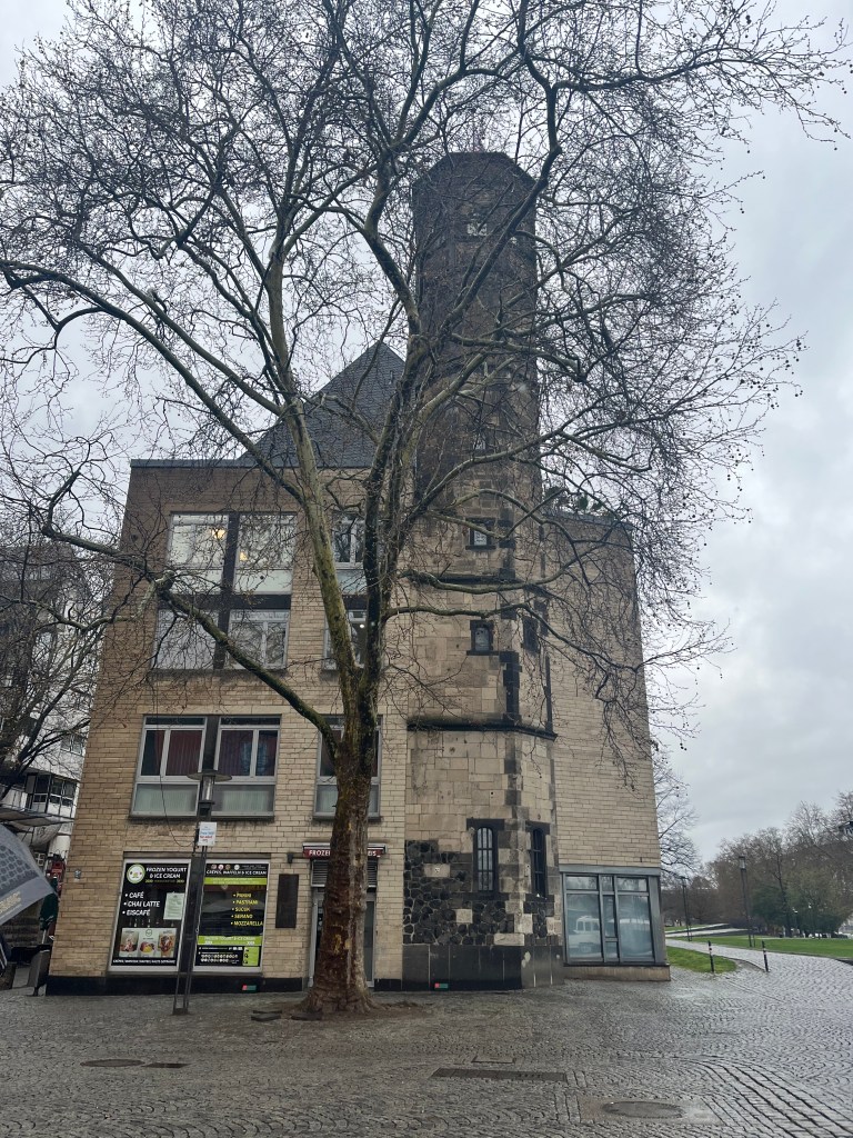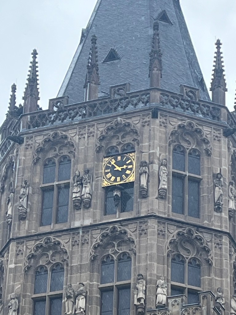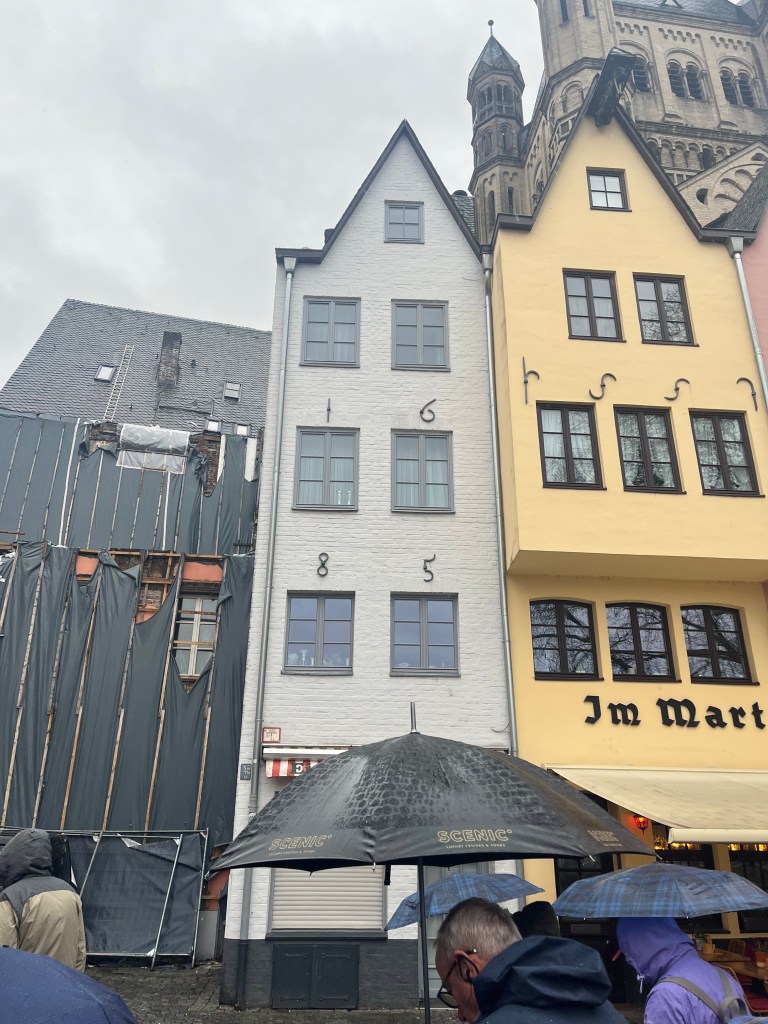 After breaking our fast at the wonderous buffet too early for my personal liking, we left the ship at 9:00 a.m. for the Koblenz walking tour. Our walking tour took us around the main historical town of Koblenz. We started with identifying the oldest remaining building (in pink) after the last time the entire town was destroyed by Allied forces, against which a new building was directly attached (in yellow). This was designated as our landmark if we got separated, given it was near where our ship was docked.