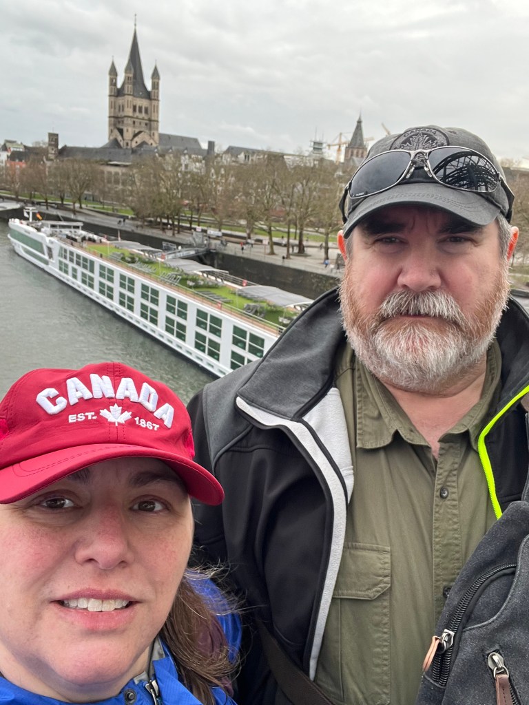 We had a little bit of time to ourselves before we had to head back to the ship, which left the port at 1:45 p.m. heading for Mannheim. Our “tour” wasn’t over this day, though, given the next several hours would take us through the Rhine Gorge. This is where the majority of the castles and other sites would be seen. The Gorge is generally well protected from the worst weather, with high hills on both sides and several curves. One side would get sunny and warm enough that there were several vineyards planted on the hills. Today was a bit cool and windy, but we parked ourselves on the sundeck recliners at the front of the ship to watch the show. My Scottish shawl came in handy today for this. Dan used his real camera and got some amazing shots, a few of the best follow with captions.