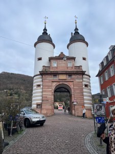The Bruckentor (Bridge Gate) leads to the Old Bridge spanning the Neckar River. There’s a sculpture of a monkey (baboon, actually) at the base of the gate called the Bruckenaffe. This one is made of bronze and replaces a 15th-century stone version, and there are a pair of small bronze mice right next to it. Apparently the baboon represented mockery and points its butt towards the city’s border to show the Elector’s power over the passing bishops, and it holds a mirror that is meant to encourage self-reflection or remember where you come from. Similar to the Tunnes und Schal statues, the baboon and mice have good luck rituals, too: rubbing the mirror will bring you money or wealth; rubbing the baboon’s fingers will ensure you return to Heidelberg, and rubbing the mice will bring you fertility. The bronze version of this baboon’s face is actually hollow, which tends to unintentionally (?) invite people to stick there head in it like a mask. Our guide did not recommend actually doing this as you do run the risk of getting stuck… and then there’s of course the unhygienic part of it. I thought I took photos of the monkey and mice, but apparently I did not. Oops.