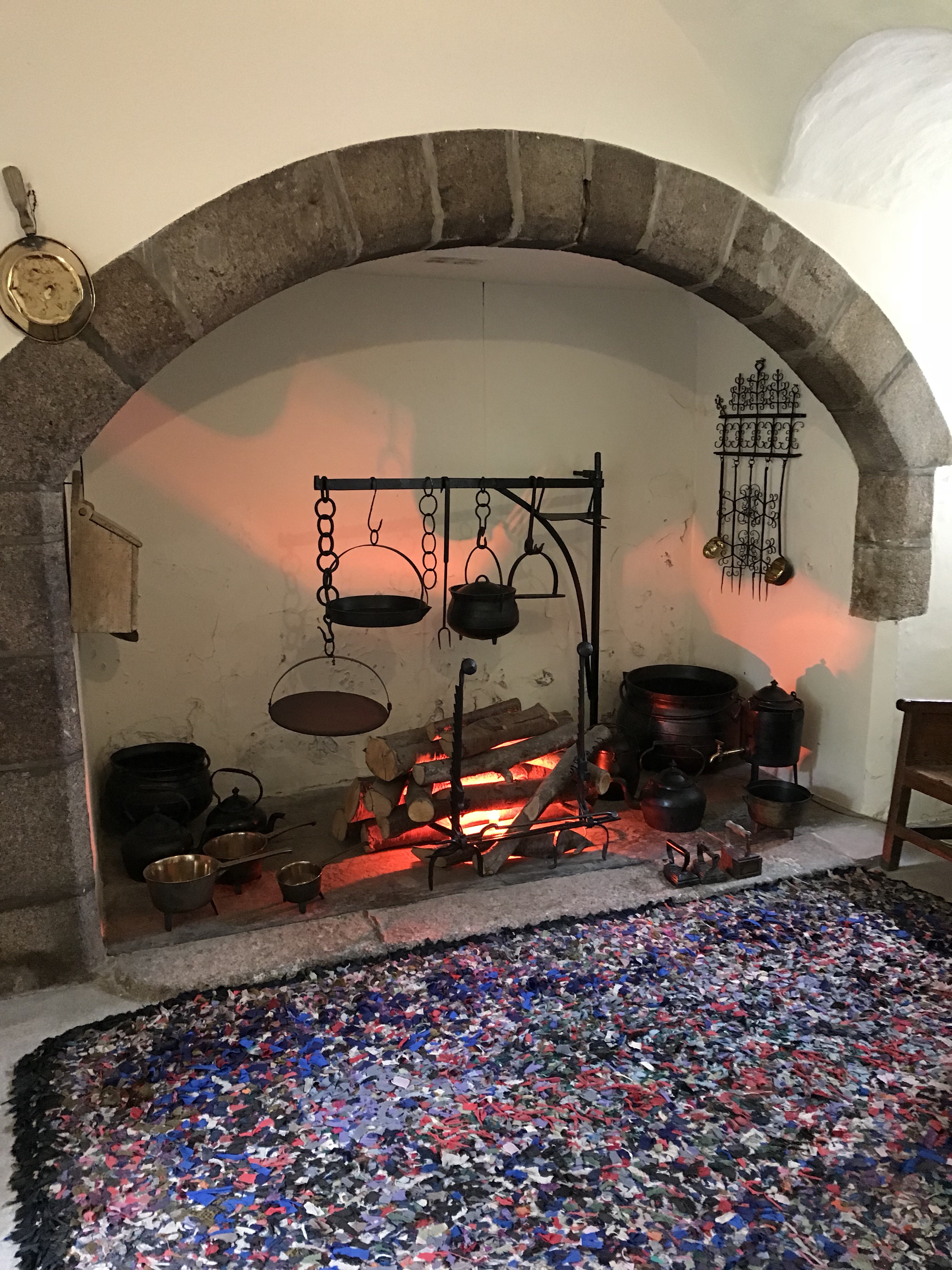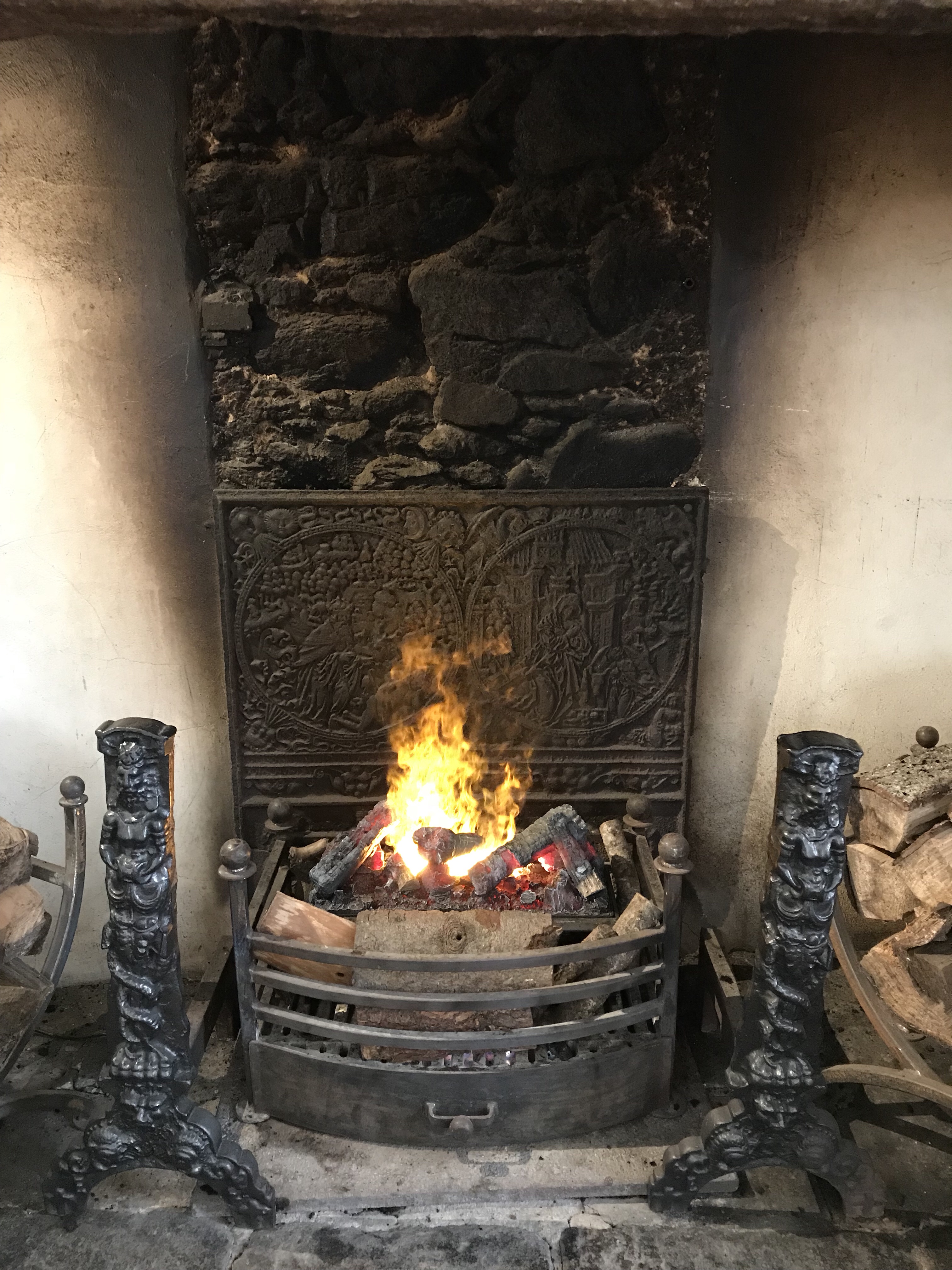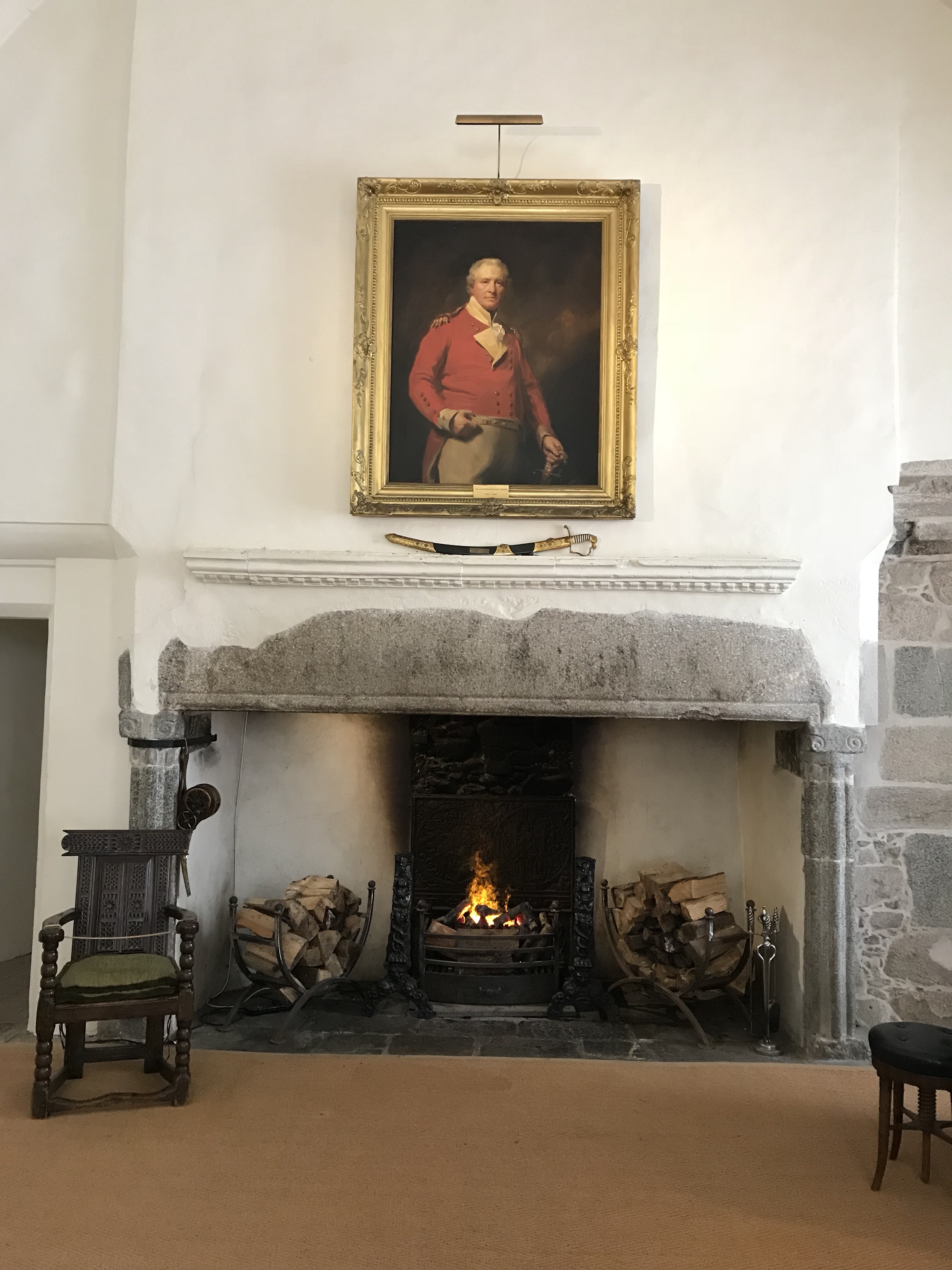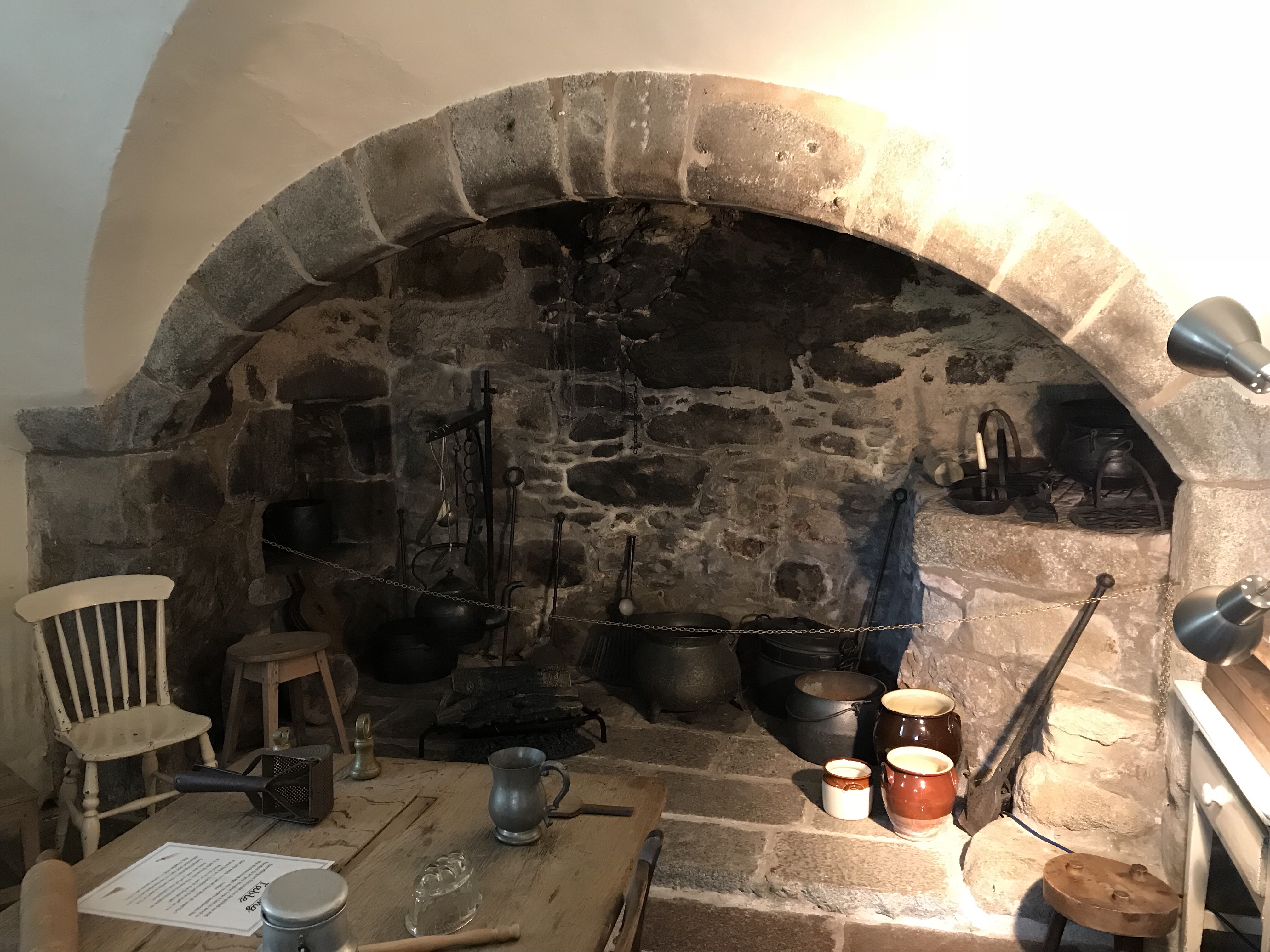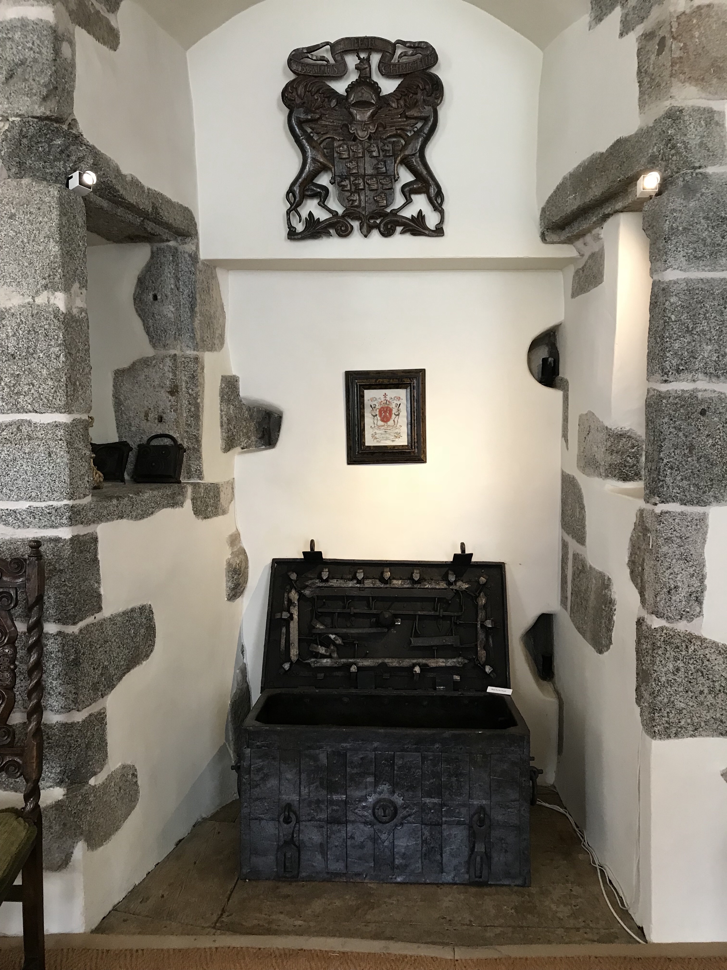 We followed the self-guided tour markers, passing through the Michael Kitchen to the Great Hall. The trunk kept in this room has some wild kind of locking mechanism. The fire backer is original.